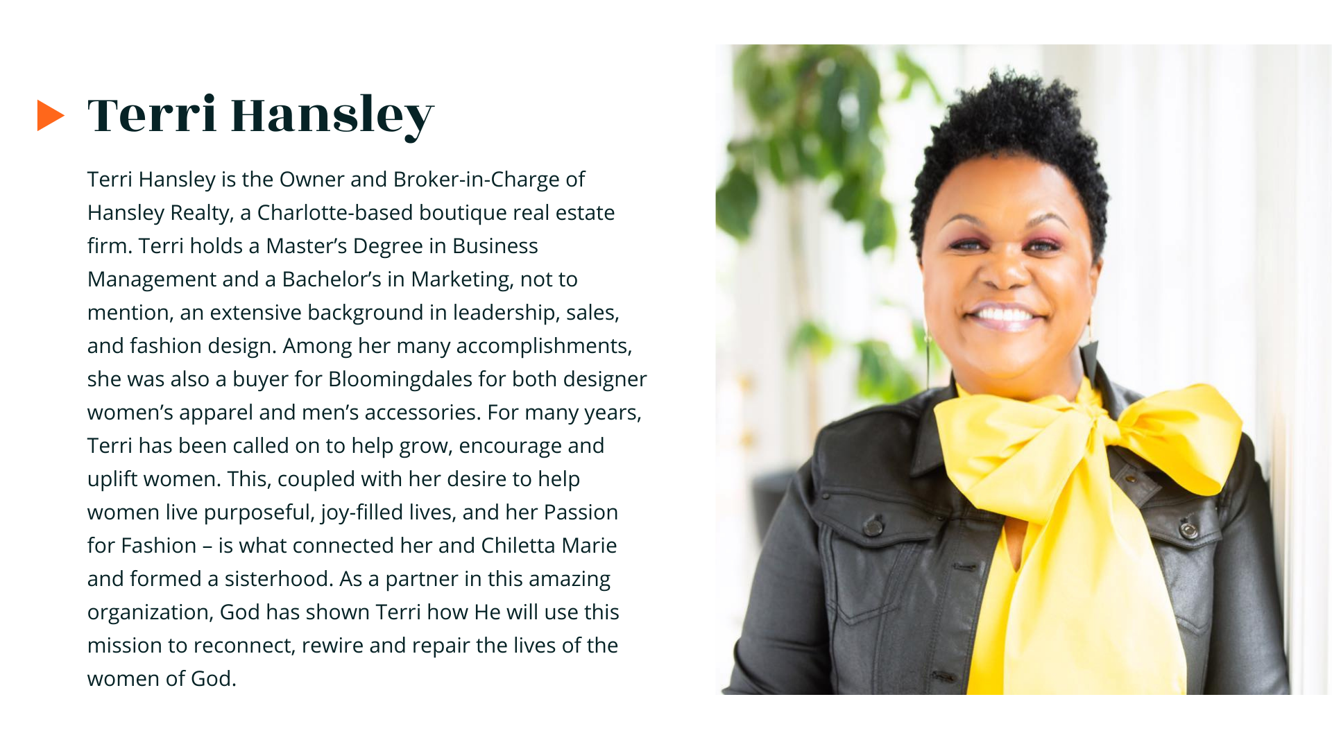 “A few years ago, I had fallen into a slump in my career and personally I just did not feel like my energetic self. Also, I had attended a leadership development training for up and coming African American leaders where I received feedback on how to combat perceptions that are often cast on African American women leaders. I told my friend Terri, I wanted to upgrade my wardrobe with a new image, and I wanted her assitance. Let’s just say this…Style does matter. Since my upgrade I have been elevated in my career twice and almost doubled my salary…Thanks Terri!”